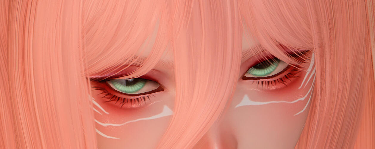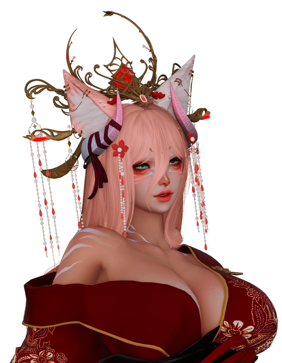 Raphtalia has a 5'6 height, slender build with curvy features. Her hair is said to be a gentle shade of pink. Her eyes are a mix of green and blue while her lips are soft red. She can be seen as having very striking white marks across her cheeks and body, showing off her kitsune qualities. When using potent amounts of Aether, she is said to have multiple fox tails which would immerge from her. Beast like horns shape around the top of her head, often fashioned with a ribbon given to her by her childhood guard.